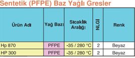 Perfluoro polyether yağ bazlı ağır hizmet gresidir. Çok yüksek sıcaklıklarda çalışabilir. (Kısa süreli 280 °C) Damlama noktası yoktur. Yüksek kimyasal dayanımı ve yüksek yük taşıma kapasitesine sahiptir. Pek çok plastik ve elostomer ile uyumludur. HP 870 genel olarak çok yüksek sıcaklıkların olduğu fırın konveyör rulmanlarında ve yataklarında, fan ve pompa rulmanları soğutma sistemlerinin kaymalı ve rulmanla yataklarında ayrıca kimya ve petrokimya endüstrisindeki doldurma ekipmanlarının yataklarında kullanılır.